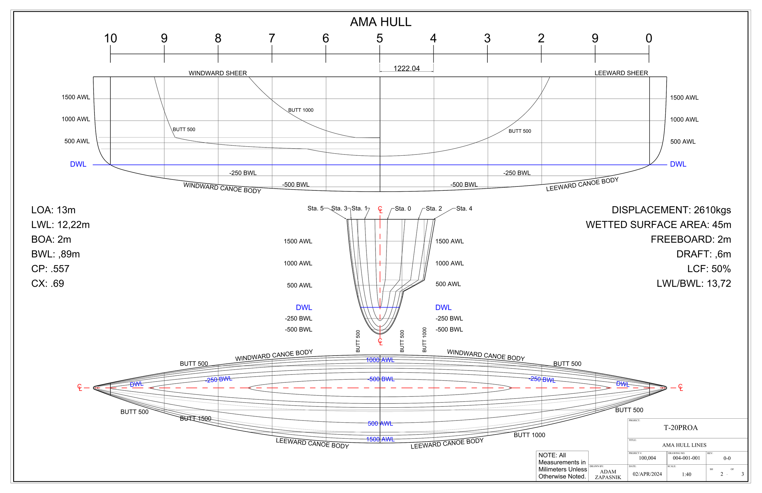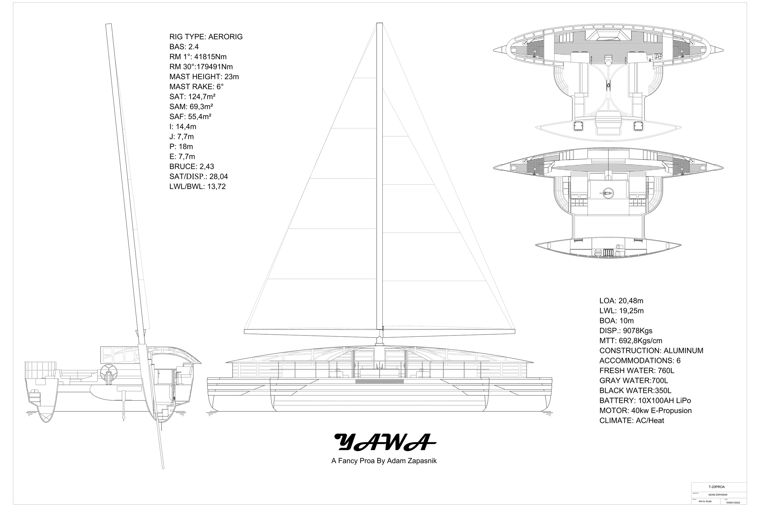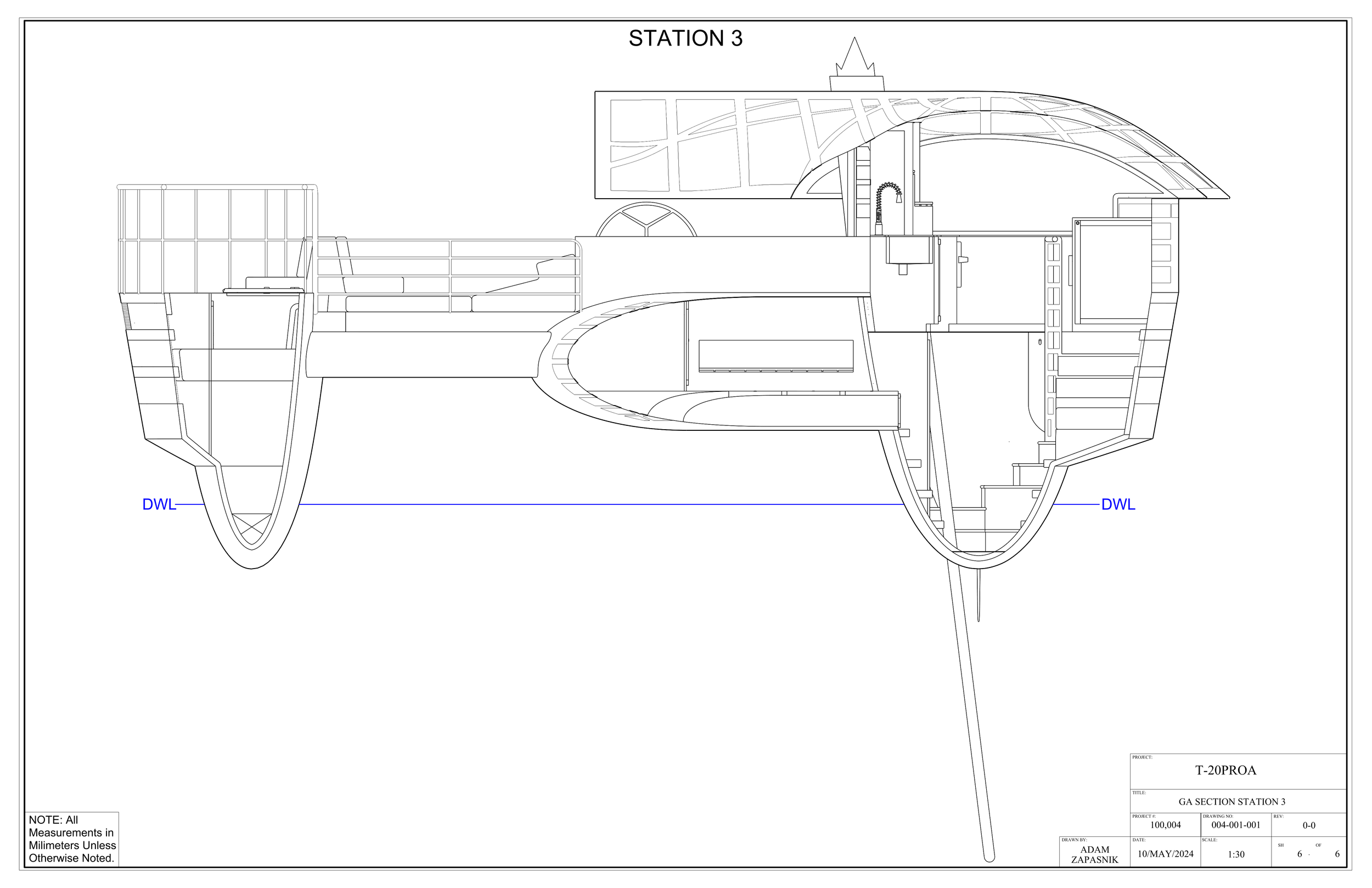 This was my final Project at The Landing School. For this project, I didn't really have any restrictions; I chose the proa because I knew it would be a major challenge and would afford me the opportunity to grow a lot. The biggest challenge I faced was finding any information about proas on the internet; this proved to be very exhausting. The few details I did find on proas are based primarily on observation, mostly from sailors who have seen or sailed one. I set out to design my hull based on my current knowledge of hydrodynamics and hydrostatics. The second big challenge was finding space inside the narrow hulls for my dream of a lavish interior space. After spending weeks working out the kinks in the hull shape through many long nights doing CFD resistance runs and making minor tweaks to my hull shape, I finally was able to start working out the interior details and machinery layout. This proa also conforms to ISO design category A for aluminum scantlings. It has a large (125 square meter) Solar Sail attached to a carbon fiber unstayed AERORIG. I worked out the bending moments and inertia. A large 10 LiPo battery bank, a 9Kw generator, and three HVAC units. This proa has one 40KW electric engine, can sleep 8, has two heads with attached shower/saunas, and a ton of open space.