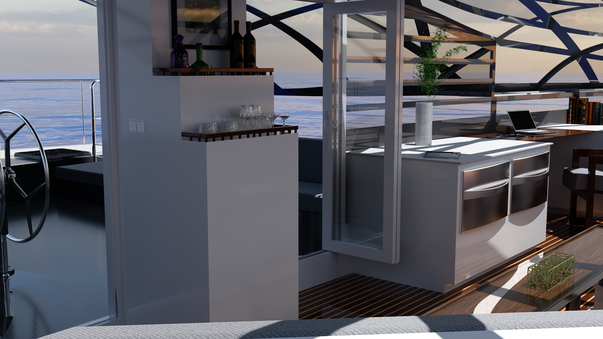 This is my favorite render. It’s a shot from the windward side of the AMA onto the deck. Here, you can see the dual-wheeled pedestal and compass, as well as into the deckhouse at the settee.
