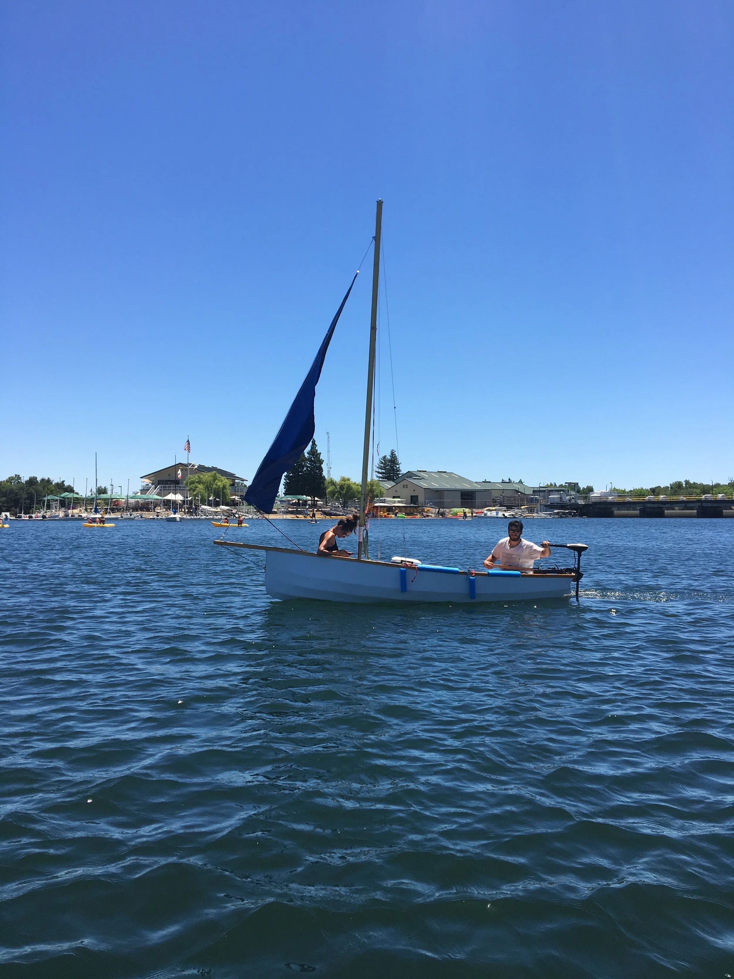Here she is on her maiden voyage. Unfortunately, there is no wind. Here, you can see my homemade tarp jib.